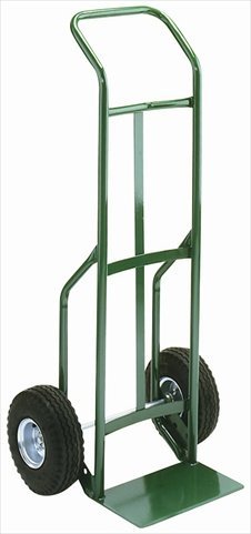 Material of Construction: Steel. Made in Taiwan. Front Wheel Size: 10". Front Wheel Type: Pneumatic. Options: 210249 054218 210079. Powered/Manual: Manual. Agency App/Cert: None. Cubic Ft: 11.85. Continuous handle with curved back design. Welded frame construction. Zinc plated Auto-Loc® axles assure smooth wheel rotation. All frames can accommodate an 8" or 10" wheel. 7" deep x 14" wide 7 gauge beveled nose plate with radiused corners for safety. 1" OD x 14 gauge wall tubular frame. Handle Type: Continuous Handle. Floor lock: None. Capacity: 500. Dimensions: 22" W x 49" H x 22" D.