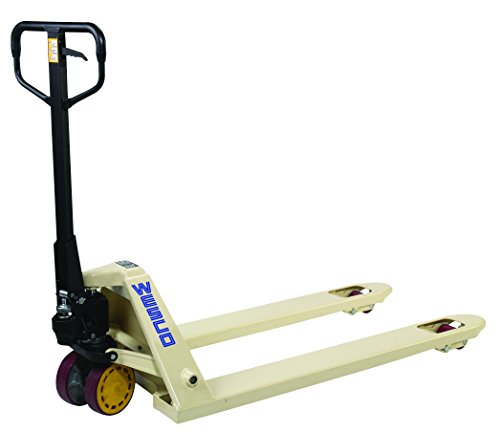 Forks are 36" long and 27" apart. Adjustable fork connecting rods. Overload bypass. Rubber coated handle. Entry and Exit Rollers. Material of Construction: Steel. Made in China. Front Wheel Size: 7. Front Wheel Type: Moldon Polyurethane. Rear Wheel Size: 3. Rear Wheel Type: Moldon Polyurethane. Raised Height: 7.75. Lowered Height: 2.9. Manual. Cubic Ft: 38.45. Handle Type: Loop Handle. Warranty: 2 Year Pump Warranty. Dimension: 27"W x 48.25"H x 51"D.