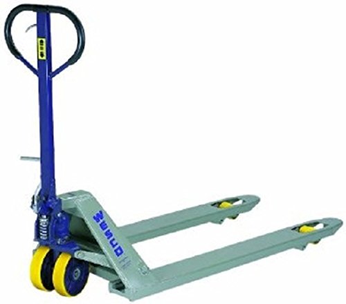 Forks 42" long and 21" apart. Pump overload bypass. Exit Rollers. Tapered fork tips. Rubber Coated Handle. 200° steering. 8 gauge 6" wide forks. Adjustable fork tie rods. Material of Construction: Steel. Made in Taiwan. Front Wheel Size: 6. Front Wheel Type: Moldon Polyurethane. Rear Wheel Size: 2. Rear Wheel Type: Steel. Raised Height: 6.25. Lowered Height: 2.125. Manual. Cubic Ft: 32.21. Handle Type: Loop Handle. Warranty: 5 Year Pump Warrenty. Dimension: 21"W x 46.5"H x 57"D.