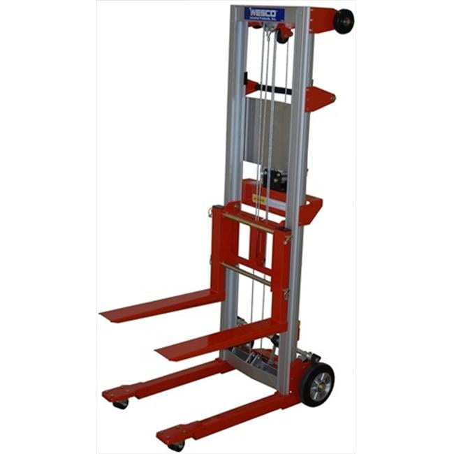 Material of Construction: Aluminum/Steel. Made in China. Front Wheel Size: 8". Front Wheel Type: Non-marking. Rear Wheel Size: 2". Rear Wheel Type: Non-marking. Options: 273518. Raised Height: 120.5/27.5". Lowered Height: 99/3.5". Powered/Manual: Manual. Agency App/Cert: None. Cubic Ft: 33.06. Aluminum and steel construction. 8" rear wheels and 2" front swivel casters are non-marking. Forks can be inverted for two different lift heights. Fork size: 4"W x 22.5"L x 1.75"H. Winch crank handle locks to secure carriage. Top of frame rollers facilitates laying truck horizontal for transport. Three models: