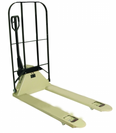 Manual pallet truck with 27 x 48 in. forks and mounted backrest